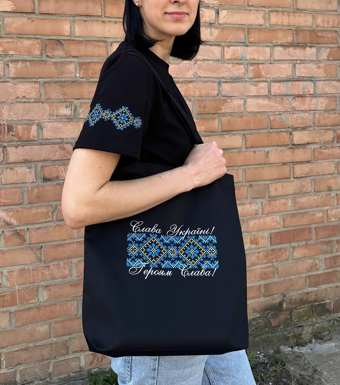 Універсальна футболка чорного кольору оздоблена жовто-блакитною вишивкою на рукавах. Модель унісекс: підійде як чоловікам, так і жінкам